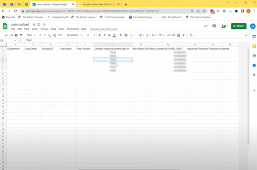 6. 现在您已经完成了将用户批量上传到 Google 管理控制台的五个必填字段,如果适用,您可以填写电子表格顶部显示的其他字段,但完成这些不是必需的。这些字段包括恢复电子邮件地址、联系电话号码、家庭住址和员工 ID 信息等信息