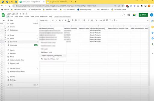 8. 一旦我们对输入到工作表上的信息感到满意,我们现在将下载 CSV 文件。要下载文件,请单击文件、下载,然后选择逗号分隔值 (.CSV)