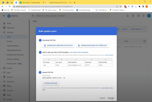 3. 打开此字段时,您将获得两个选项。第一个选项是以 CSV 文件格式下载当前用户信息或下载空白 CSV 模板,第二个选项是附加 CSV 文件,用于将新用户上传到 Google 管理控制台