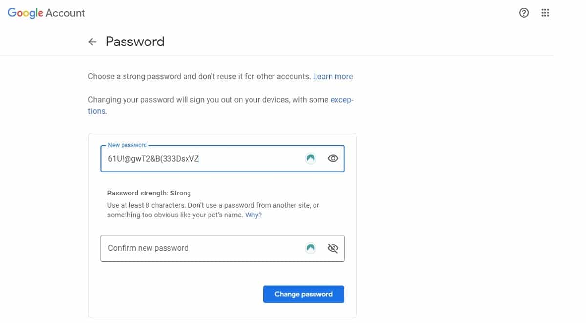 向下滚动到登录 Google 区域,然后点击密码。如果出现提示,请重新输入当前密码。现在在上面的文本框中输入您要使用的新密码。在下方文本框中输入相同的密码,然后点击创建密码进行更改。
